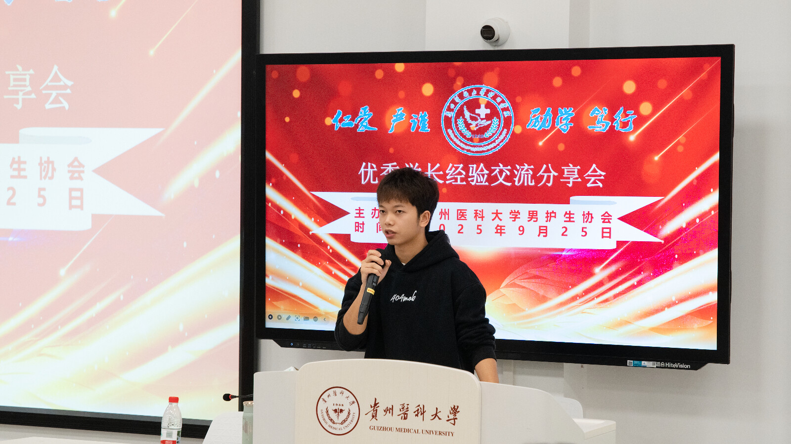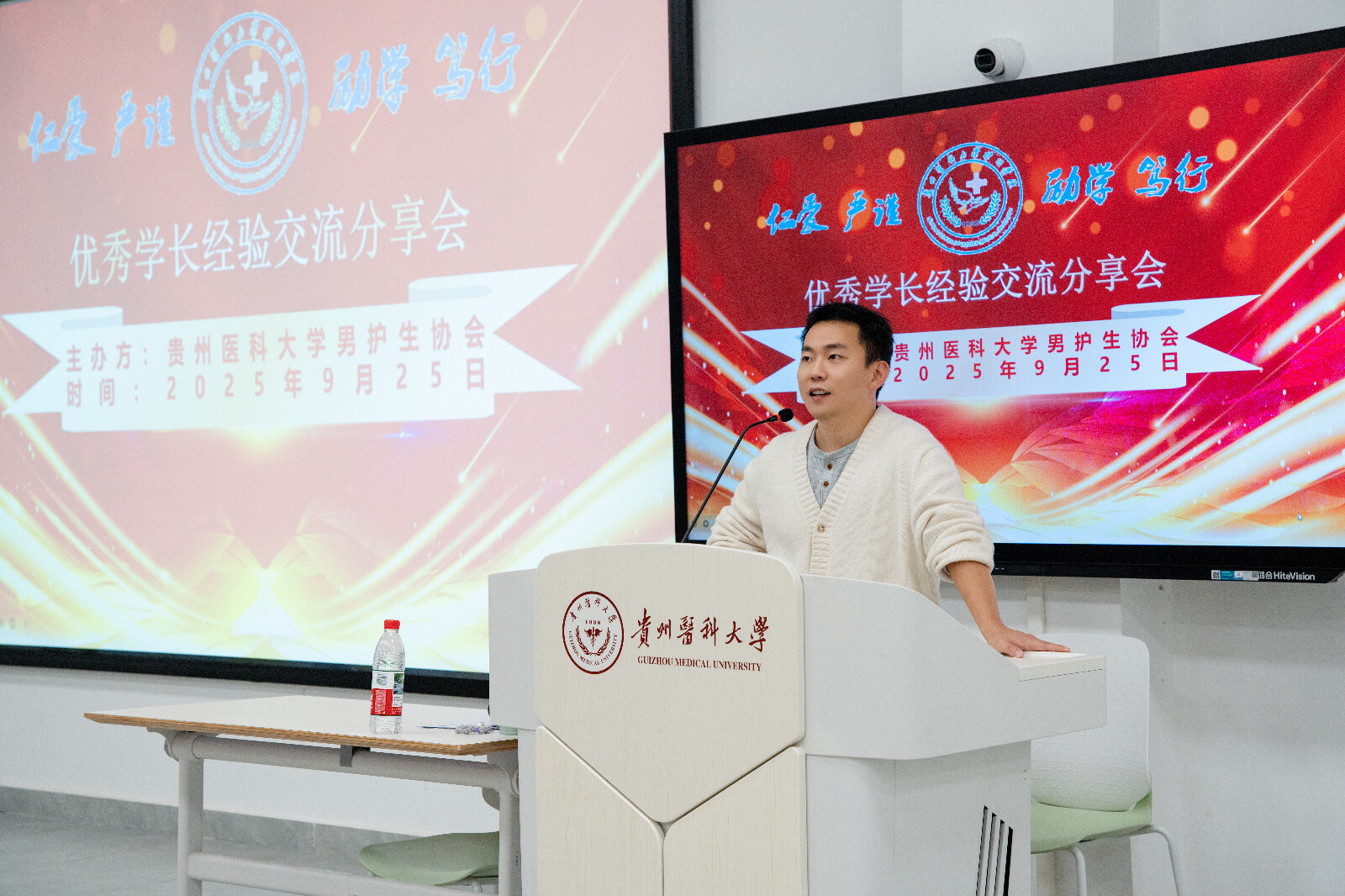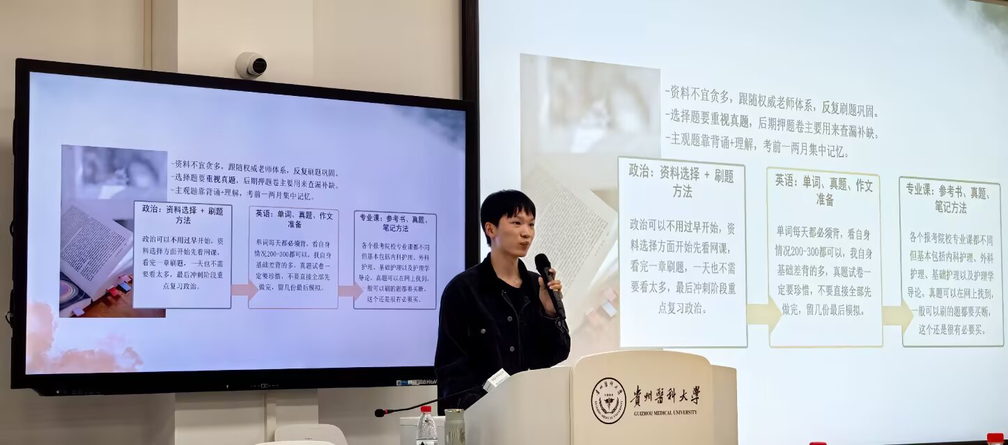 为充分发挥优秀学长的引领示范作用,进一步增强男护生的职业认同感,帮助树立正确的职业观、就业观和择业观,贵州医科大学男护生协会在云漫湖校区临床组团M101教室开展了优秀学长经验交流分享会。唐郅尧、田志豪、王小猛等三位优秀学长代表受邀进行了经验交流分享,新利体育学生第三党支部书记刘妍及各年级辅导员代表出席会议,2025级近200名男护生代表参加了分享会。