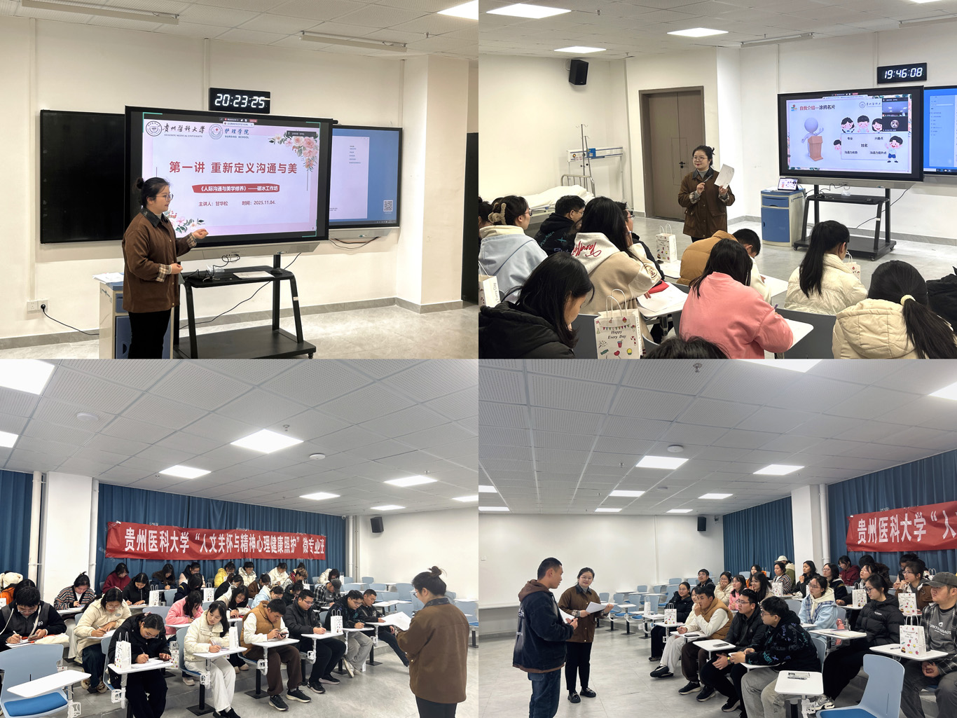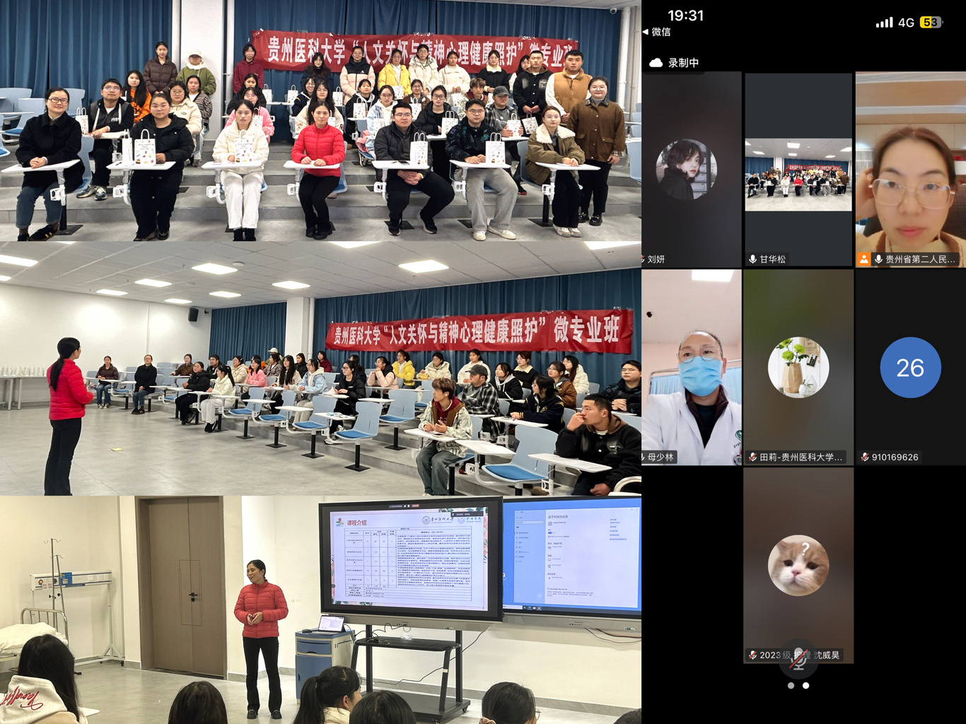 为积极响应国家加强精神卫生服务体系建设的号召,适应新时代精神健康服务需求,培养兼具专业技能与人文关怀素养的健康照护人才,贵州医科大学开设的“人文关怀与精神心理健康照护”微专业于11月3日在云漫湖校区临床组团酬勤楼示教室举行了开课仪式。开课仪式采用线上线下相结合的方式进行。护理人文教研室主任张仁莉,教师李红、刘妍以及贵州医科大学附属医院心理精神科护士长田莉、精神专科护士母少林和甘华松、贵州省第二人民医院康复科主任刘义、课程秘书覃启柔等微专业团队老师以及32名微专业学员共同参与。