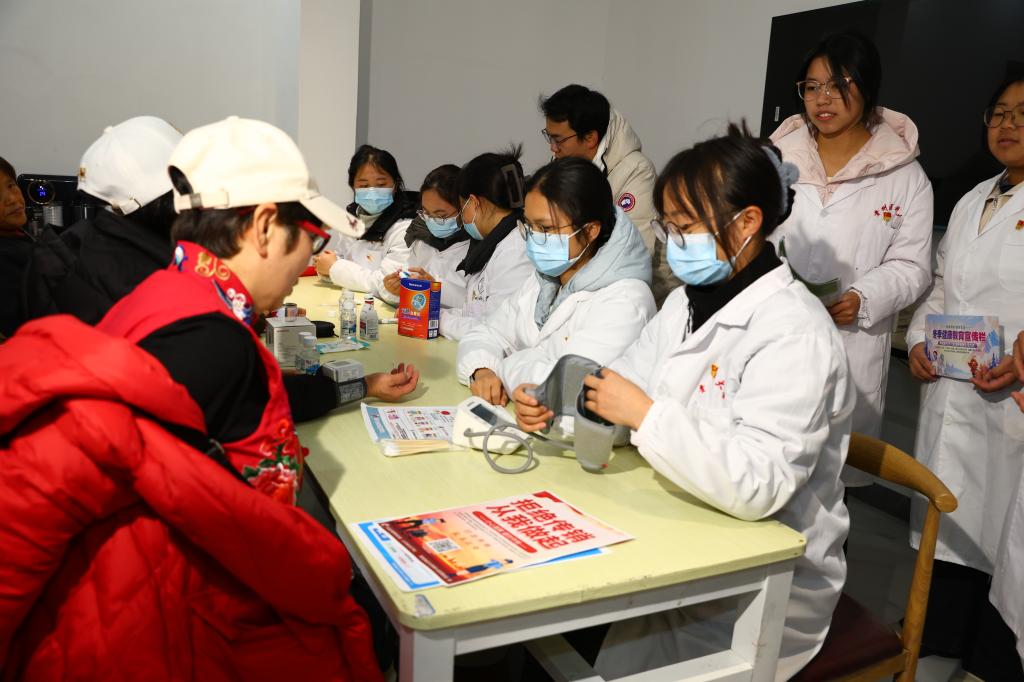 活动过程中,师生党员有序开展血压血糖检测、健康科普等服务,针对老年群体高发的高血压、糖尿病、脑卒中等疾病,细致解读检测结果,讲解疾病预防、饮食调理及日常护理要点,互动氛围热烈。此次活动既为居民提供了便捷专业的服务,提升了老年群体健康管理意识,也锤炼了师生党员的责任担当。